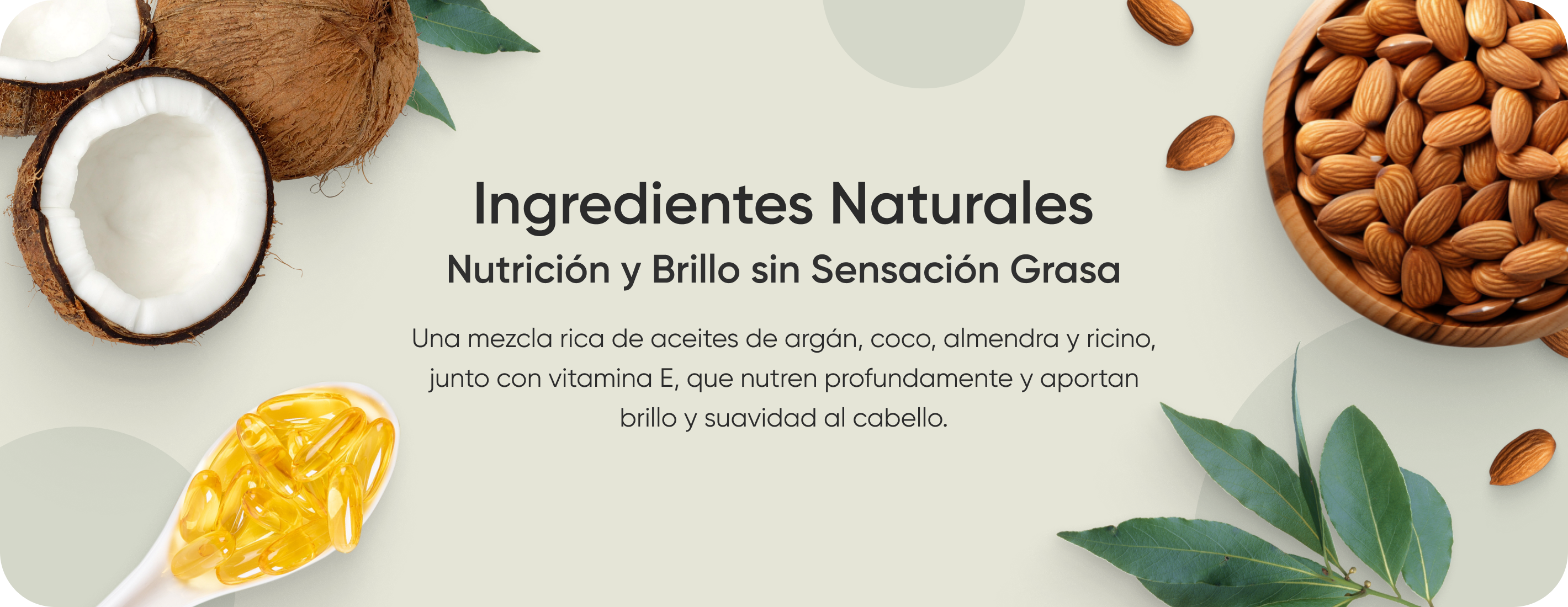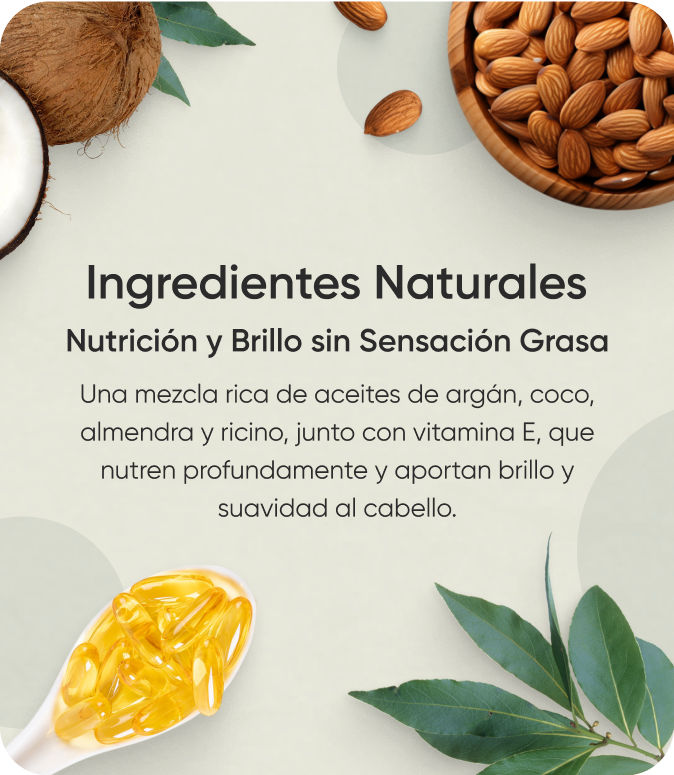 Aceite de argán, Aceite de coco, Aceite de almendras, Aceite de ricino, Vitamina E.