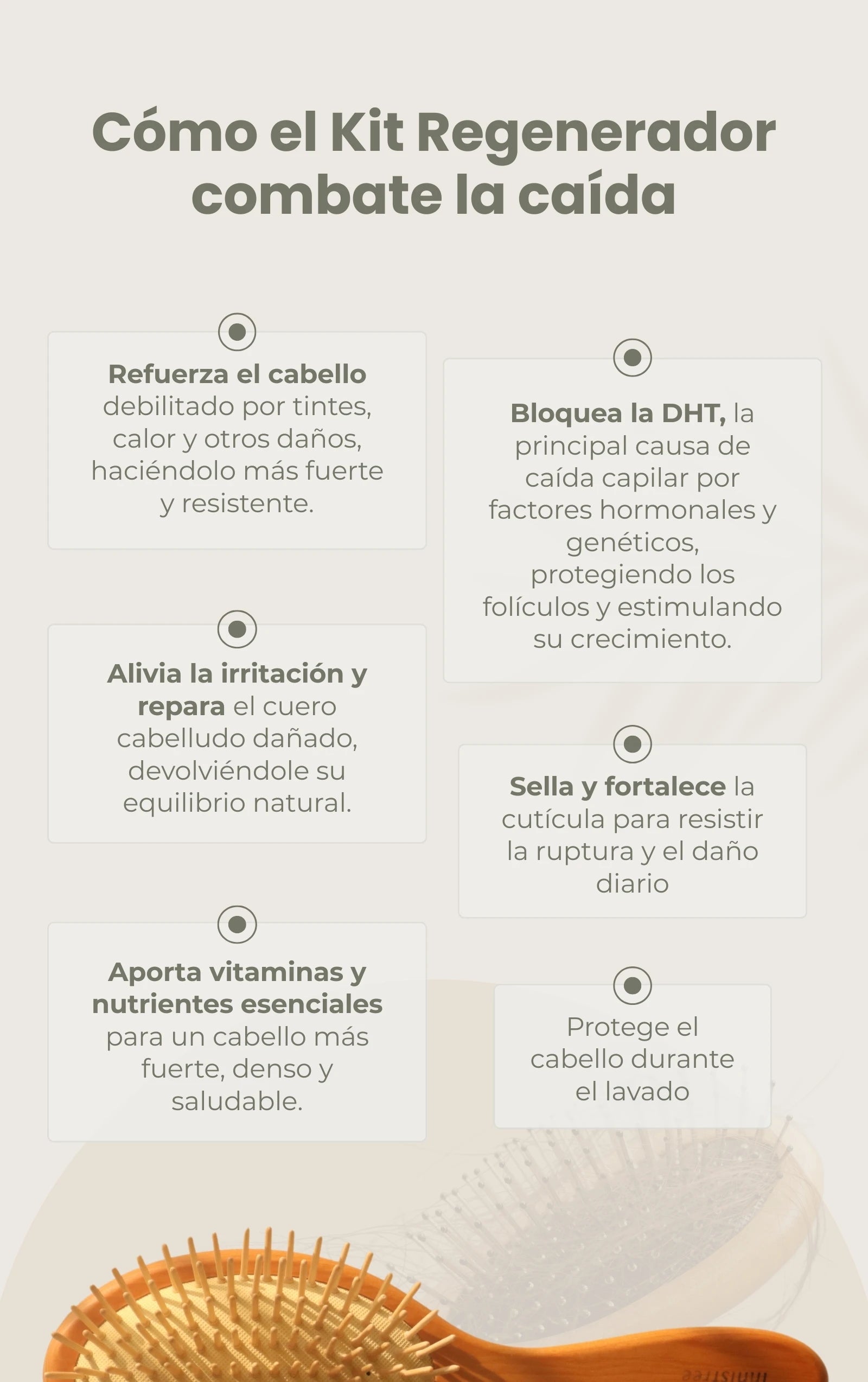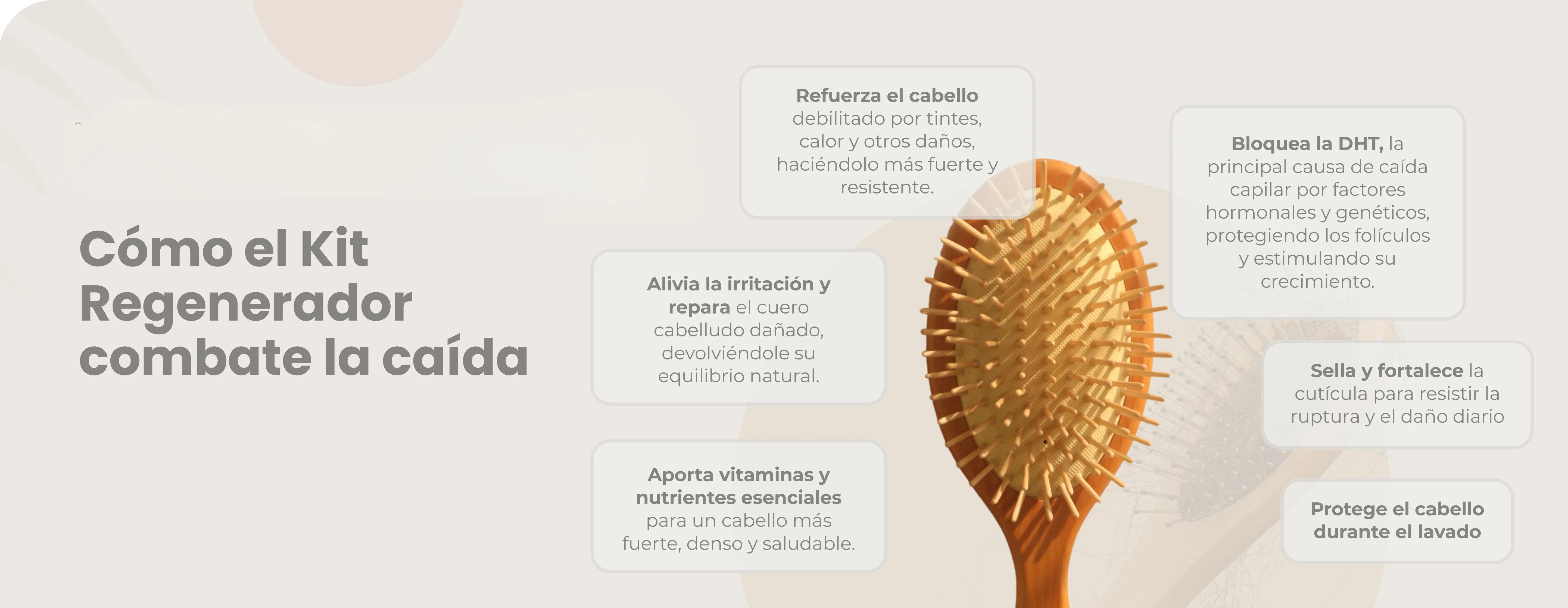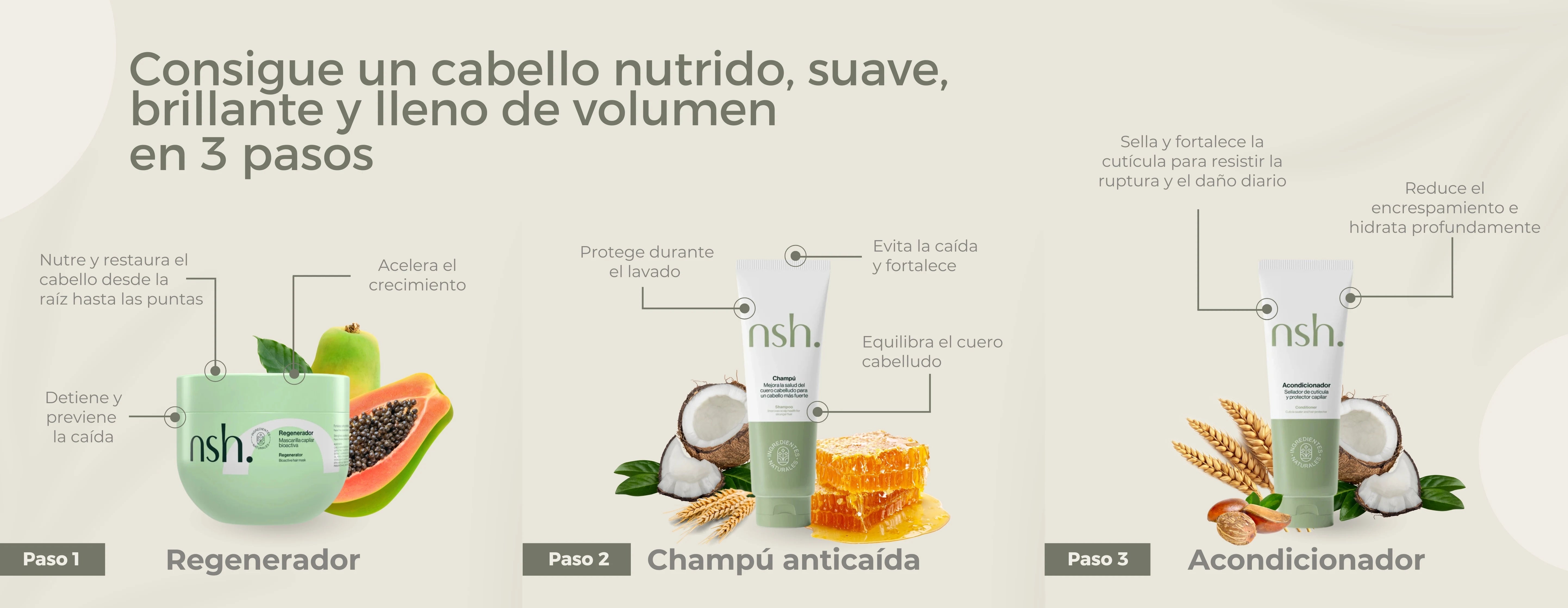 Al incorporar estos tres productos en la rutina de cuidado capilar, se pueden resolver problemas como la caída excesiva del cabello por diversas causas (hormonales, químicas, mecánicas, nutricionales), distintos tipos de alopecia, incluida la causada por quimioterapia, falta de crecimiento o crecimiento lento, cabello escaso o fino, maltrato severo, falta de brillo, sequedad o exceso de grasa, puntas abiertas, caspa, frizz, dificultad para manejar el cabello y daños por tratamientos químicos o factores ambientales. Además, contribuyen a normalizar los niveles de grasa del cuero cabelludo, aumentar el volumen y mejorar la textura general del cabello.