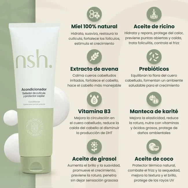 Al comprar este pack adquieres un sistema completo de cuidado capilar que incluye un champú con prebióticos de 300 mL con aceite de coco, miel y extracto de avena; un acondicionador de 300 mL enriquecido con ingredientes nutritivos como miel, avena, manteca de karité y varios aceites naturales; y un regenerador intensivo de 500 mL con aloe vera, frutas, leche, huevo y colágeno. Todos los productos están libres de parabenos y sal, utilizan ingredientes naturales 100% puros, de alta calidad y están diseñados para uso regular en todo tipo de cabello, incluyendo el tratado químicamente3