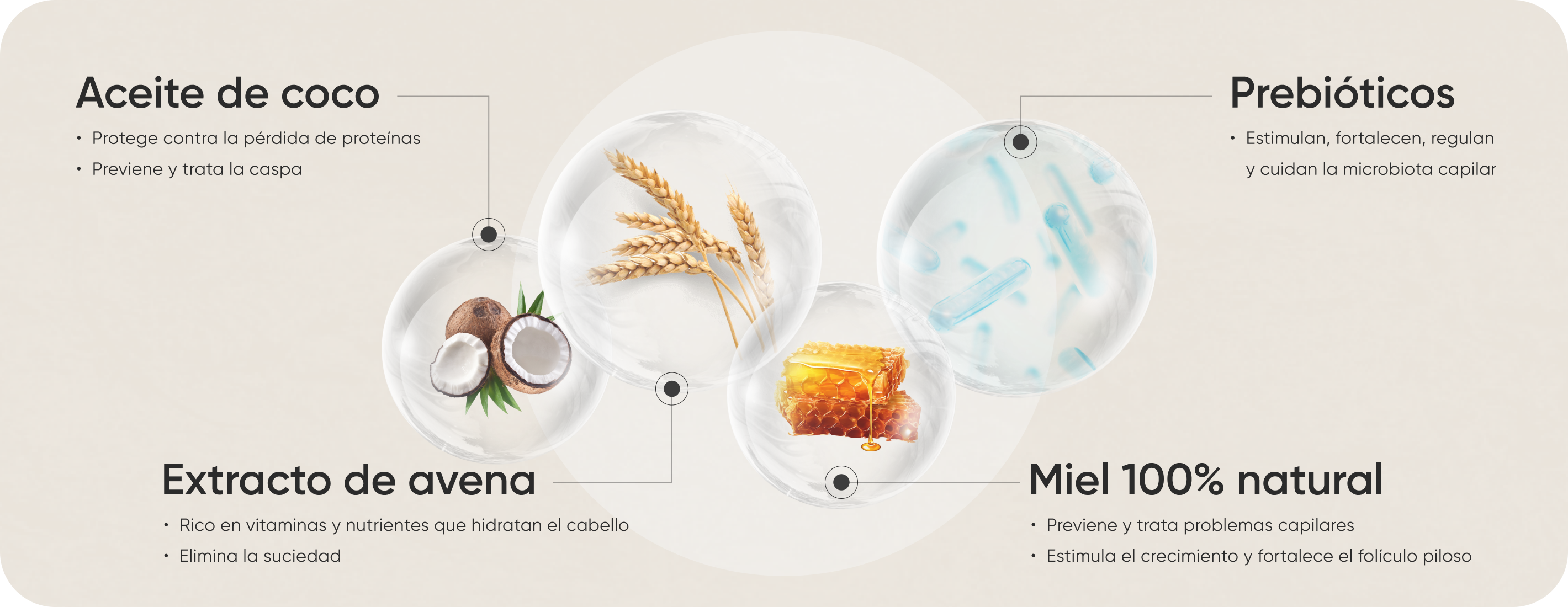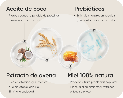 Prebióticos, Aceite de coco, Miel (100% natural), Extracto de avena.