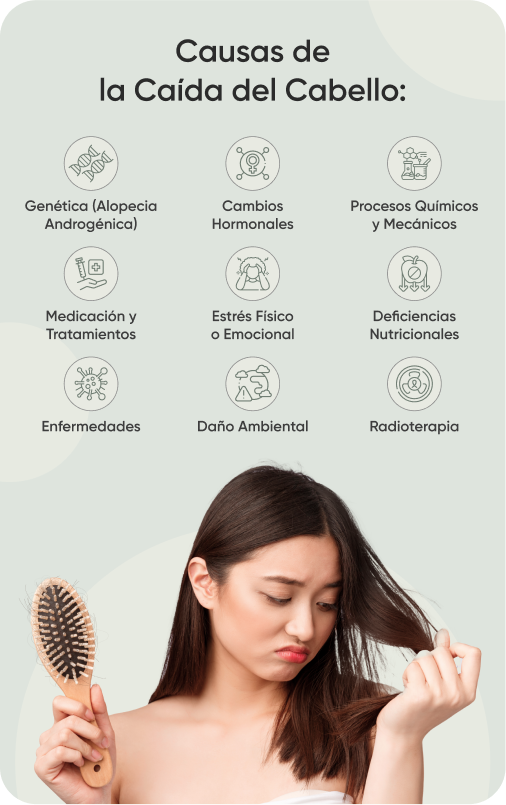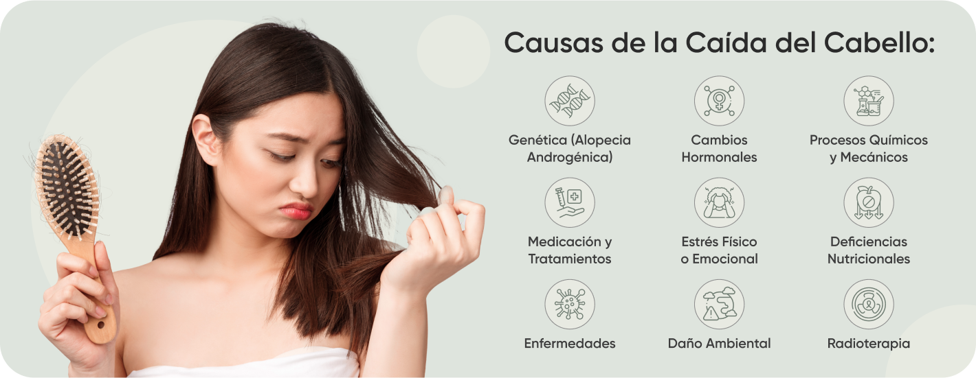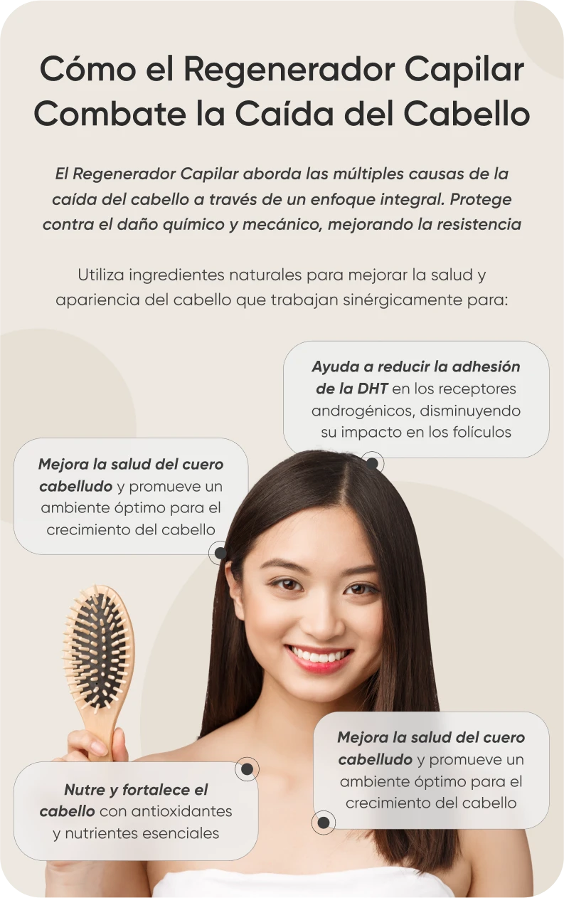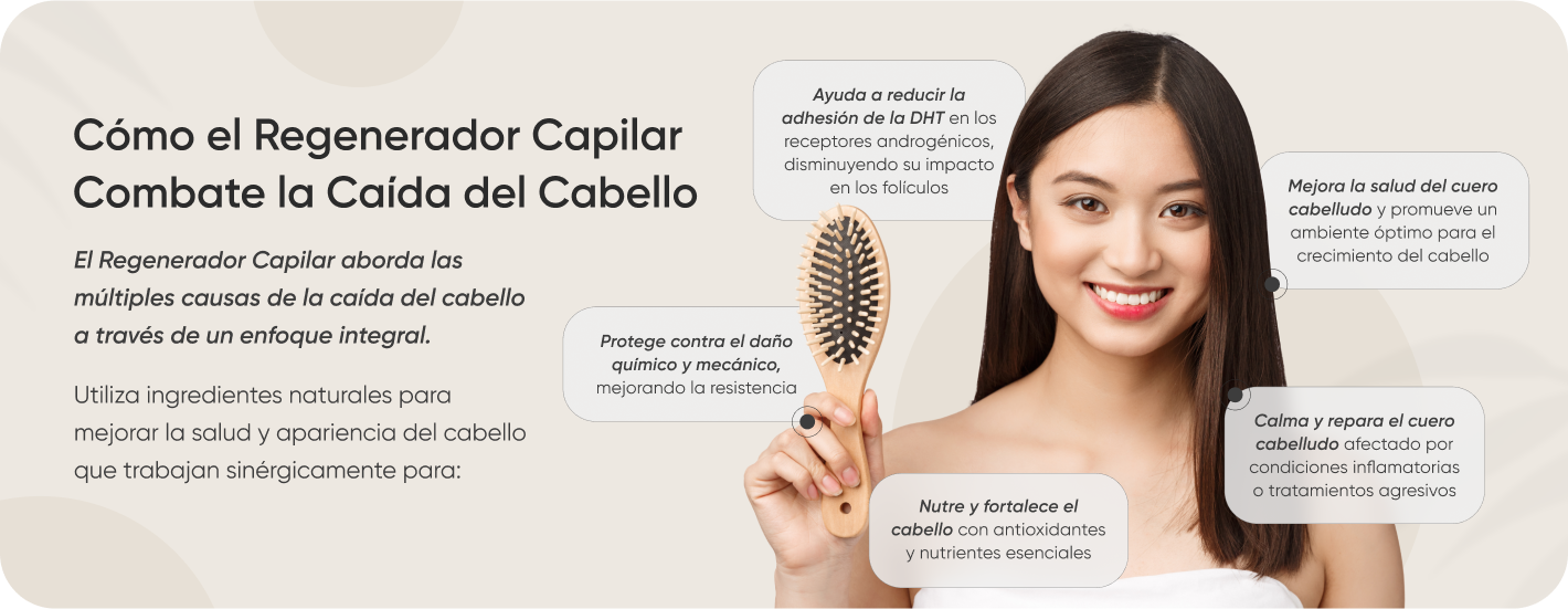 Combate la caída excesiva del cabello, ya sea por causas hormonales (incluida la menopausia), factores químicos (tintes, decoloración, alisados), daño mecánico (uso excesivo de planchas, secadores, gorras), deficiencias nutricionales, cualquier tipo de alopecia, incluida la provocada por quimioterapia, o daños ambientales (exposición prolongada al sol, agua de mar, contaminación), entre otros factores.