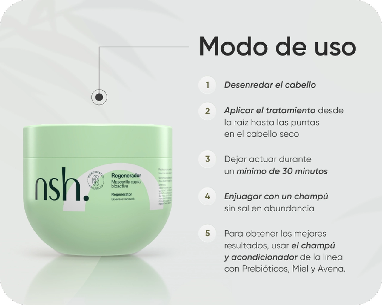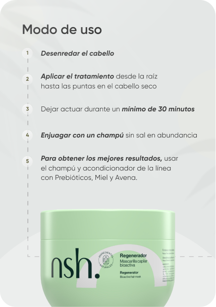 Desenredar el cabello, aplicar el tratamiento de raíz a puntas con el pelo seco, dejar actuar (mínimo 30 minutos) y enjuagar con suficiente champú sin sal. Para garantizar la efectividad del producto se sugiere el champú de nuestra línea con Prebióticos, Miel y Avena, y completar el tratamiento con nuestro acondicionador enriquecido con Manteca de Karité. Usar mínimo 2 veces por semana.